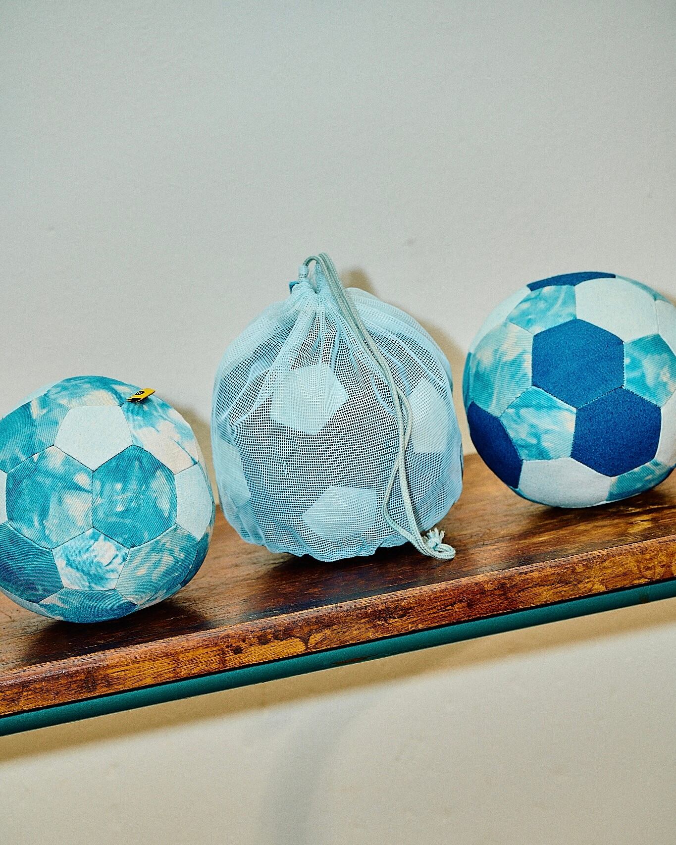 丁寧に染められた藍染生地を1点1点ハンドメイドで縫い上げたサッカーボール型のクッションは、非常に温かみがあり、中綿が程よく詰まった思わず手に取りたくなるアイテムです。