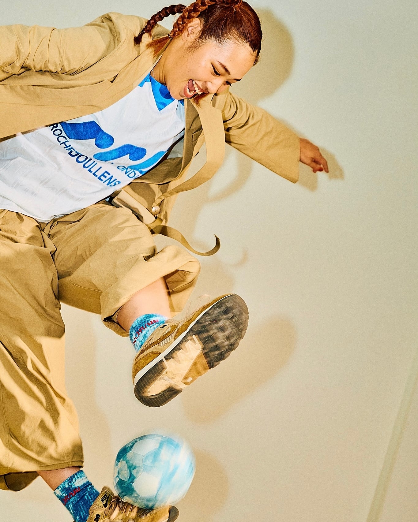 現役中にニューヨークやバルセロナ、北欧などで暮らした経験から、ストリートやスポーツといったエッセンスを等身大の目線で解釈し、「究極の循環型」である日本古来の発酵藍染を用いて表現しています。